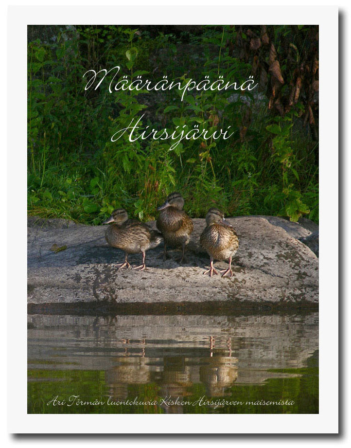 ValokuvateoksetToteutin pitkäaikaisen haaveeni omasta valokuvakirjasta vuonna 2005. Olin kuvannut kesämökkijärven ympäristöä jo useamman vuoden ajan ja järven vesienhoitoyhdistys kaipasi tuotetta varainkeräykseen. Tuotin omalla riskilläni luontokuvakirjan "Määränpäänä Hirsijärvi", jonka tuoton ohjasin lyhentämättömänä järven kunnostamisen hyväksi. Kirja on loppuunmyyty, mutta sitä saattaa löytyä antikvariaateista.Toinen valokuvakirjani syntyi vuosien 2009 ja 2010 kuvausretkien innoittamana. "Hirsijärven kosteikoissa" tuli markkinoille vuoden 2010 loppupuolella. Kuten ensimmäisen kirjan, myös tämän painokustannukset saatiin kuoletettua jo muutaman viikon kuluttua valmistumisesta. Suuremmasta painoksesta johtuen kirjaa on edelleen pieni määrä varastossa ja tilattavissa tekijältä 15 euron hintaan (+ toimituskulut). ![]() Kolmas kirja "Ruudun takaa" julkistettiin 17.3.2024. Kirja on runokokoelma, jossa luontovalokuvat ja runot nivoutuvat saumattomasti yhteen. Kirjaa on tilattavissa tekijältä 30 euron hintaan (+ toimituskulut). sivu päivitetty 22.9.2024 | ![]() | |
